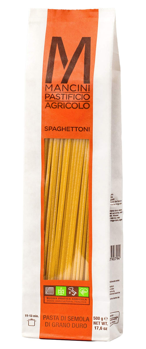マンチーニ社の太めのスパゲッティ「スパゲットーニ」。2.4mmの麺は、濃厚なソースや肉料理とよく合います。おすすめキーワード: スパゲットーニ, パスタ, 太麺パスタ, マンチーニ, イタリア産, 500g