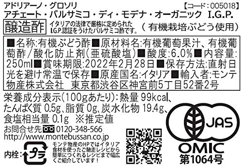 有機栽培されたぶどうを使用したオーガニックバルサミコ酢。おすすめキーワード: バルサミコ酢, バルサミコ, オーガニック, アグロソリ, イタリア産, 250ml