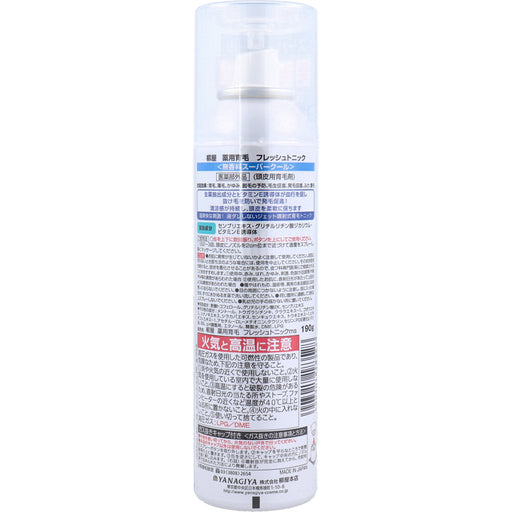 超爽快な刺激!液ダレしないジェット噴射式育毛トニック。●生薬抽出成分とビタミンE誘導体が血行を促し、抜け毛を防いで発毛促進!●天然柑橘成分が頭皮にうるおいを与え柔軟にします。●4種類の天然柑橘成分(保湿成分):橙、柚子、葡萄柚、檸檬。【医薬部外品】頭皮用育毛剤販売名:柳屋 薬用育毛 フレッシュ...