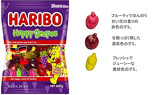 グレープ味のグミキャンディ。おすすめキーワード: ハリボー, グミ, グレープ, ドイツ産, 200g