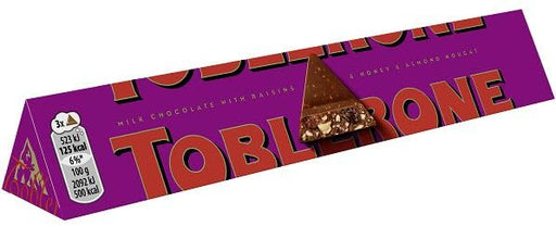スイスの象徴!三角形のチョコレートでおなじみ、トブラローネ フルーツ&ナッツチョコレート。ミルクチョコレートに、カリッとしたアーモンドとレーズン、ハチミツヌガーを練り込みました。