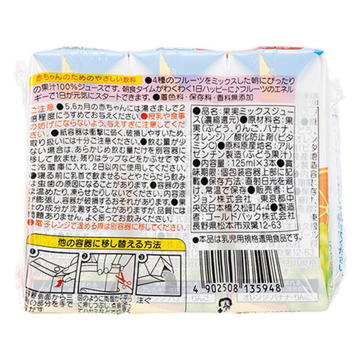 軽くて持ち運びに便利な紙パック飲料。飲みきりサイズの125mL×3個パック。曲がるストローなので、お子様の飲みやすい角度で飲めます。●4種類(ぶどう、りんご、バナナ、オレンジ)の果汁をミックスさせた朝食に最適な飲料です。●食塩・砂糖は使用していません。●着色料・保存料・香料無添加です。●乳児用...