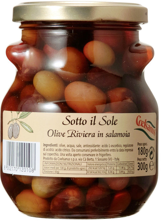 褐色のオリーブを塩水漬けにした「オリーブリヴィエラ」。まろやかな塩味が特徴です。おすすめキーワード: オリーブ, オリーブリヴィエラ, チェルサヌス, イタリア産, 300g